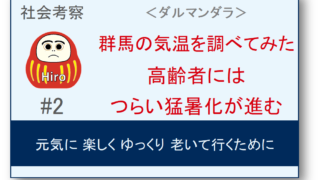 社会考察 群馬の気温を調べてみた。高齢者にはつらい猛暑化が進む。(社会#2) 9月に入っても猛暑日が続いています。群馬に住んでいると、年々暑さが厳しくなっているのを肌で感じます。そこで、実際に気象庁のデータを調べ、群馬(伊勢崎市・前橋市)の気温の変化をまとめてみました。 群馬(伊勢崎市・前橋市)の気温 まずは、今年の... 2025.09.04 社会考察