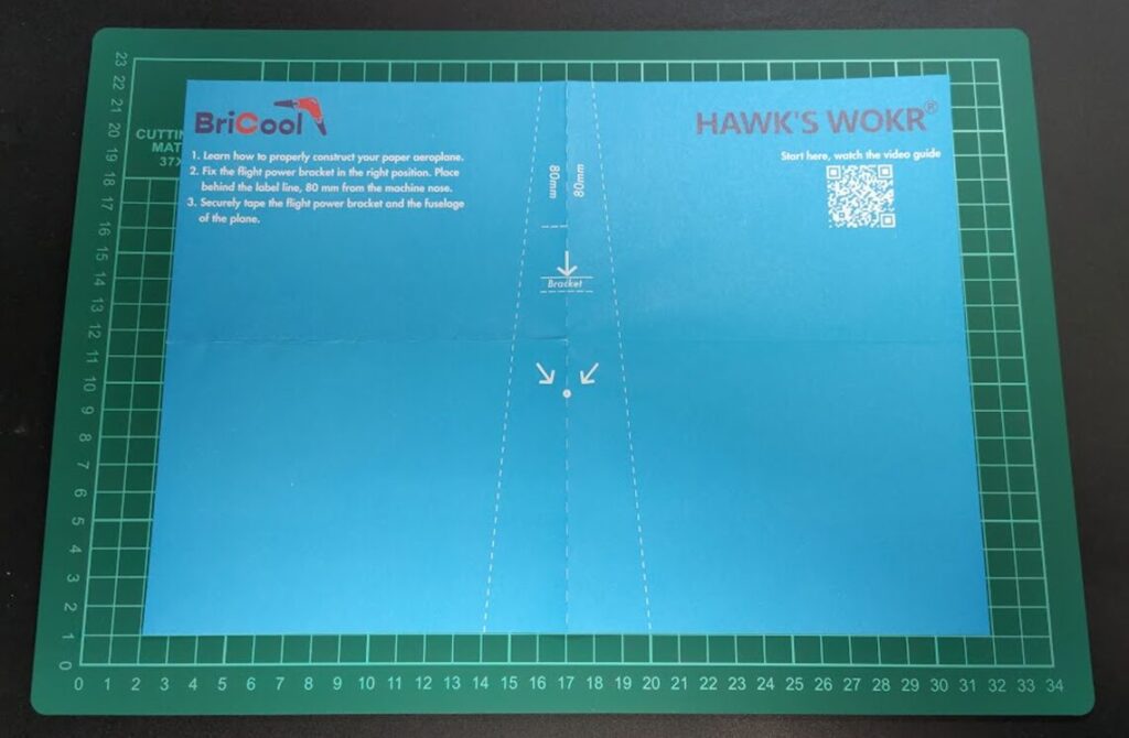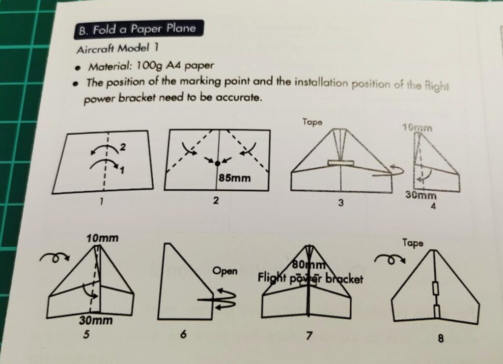 取扱説明書または動画を見ながら、紙飛行機を折り、飛行用パワーブラケット(モーター部分)を取り付けてください。