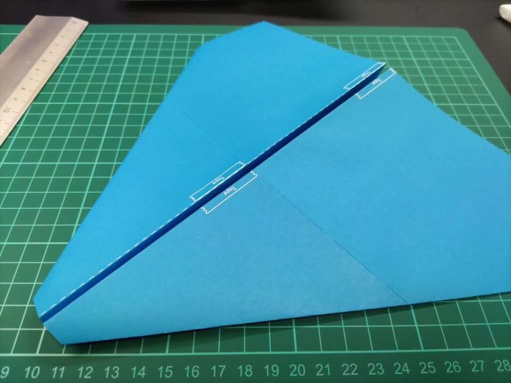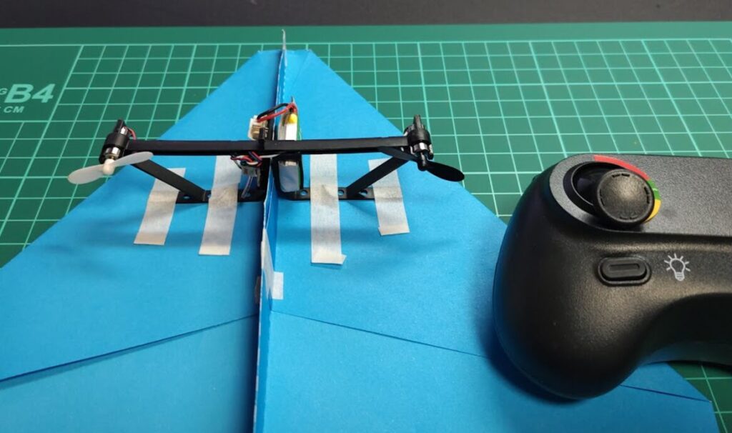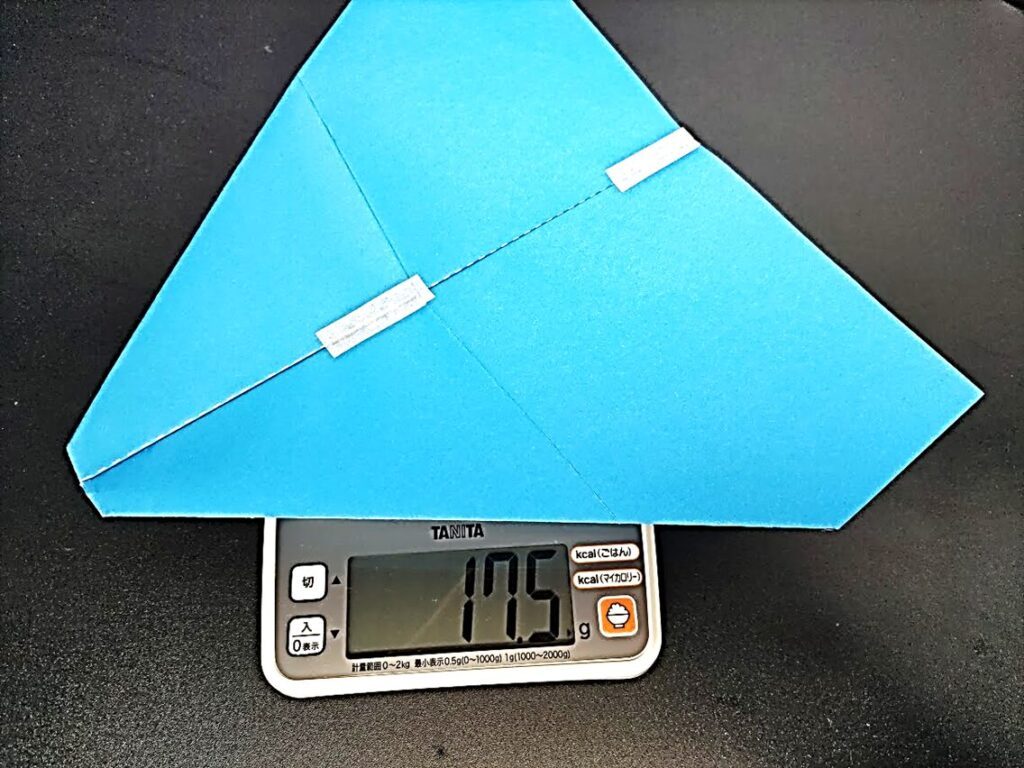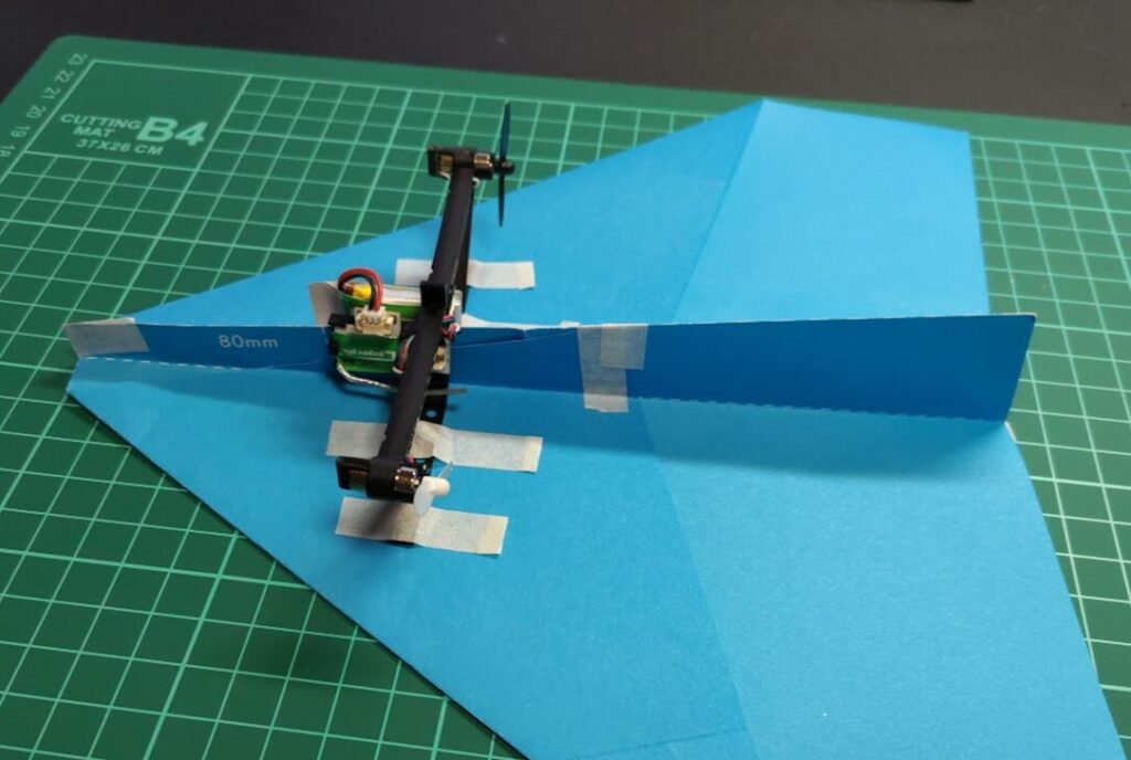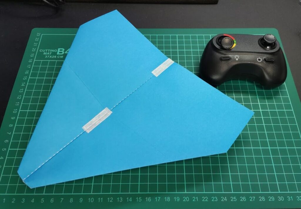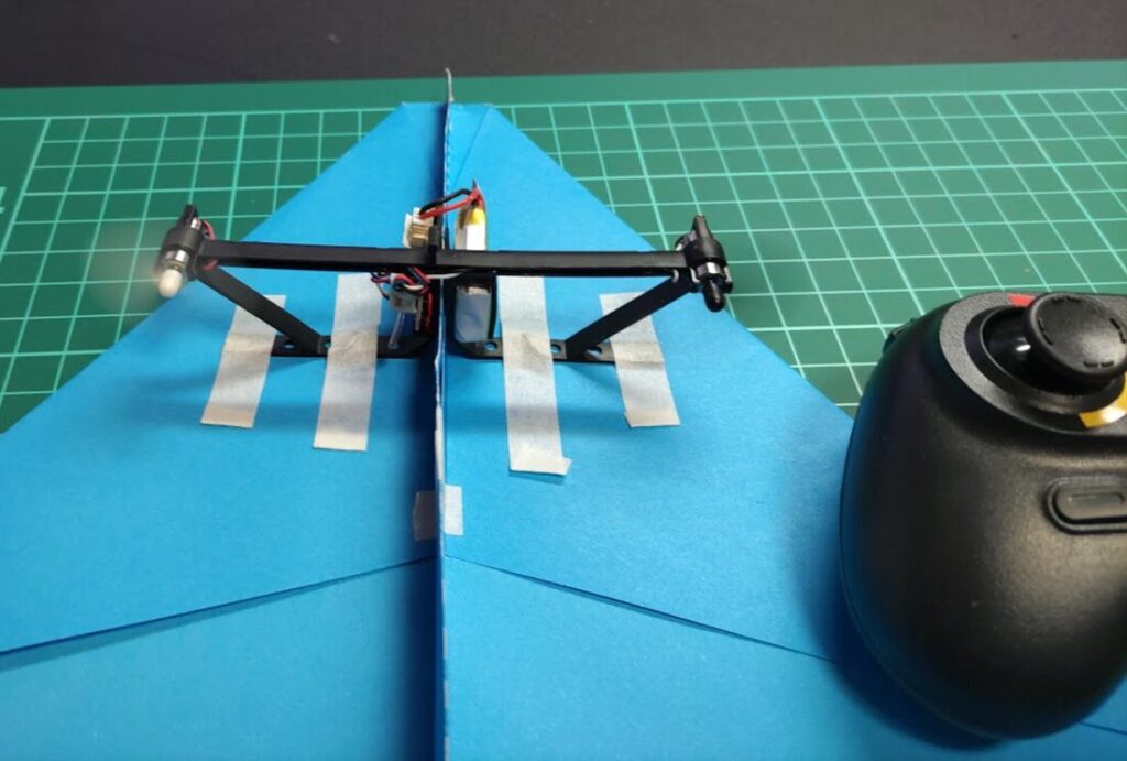 紙飛行機を折って、パワーユニットをテープで貼るだけ。