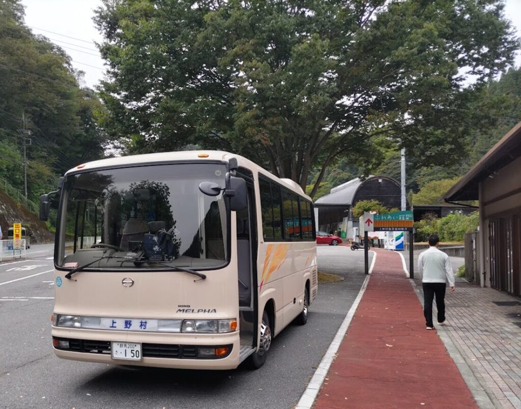 総合案内所前に止まっていた 上野村のバスに乗り込み、出欠確認を終えて 12時50分に出発。