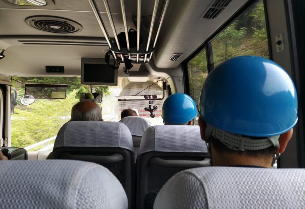 バス内で、発電所の紹介ビデオを見ながら、準備してあるヘルメットと 無線式イヤホンを装着しました。