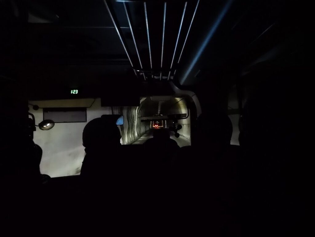 東電のライトバンが先導して、地下500mを目指して、トンネル内を ゆっくり ゆっくり ひたすら下っていきます。
