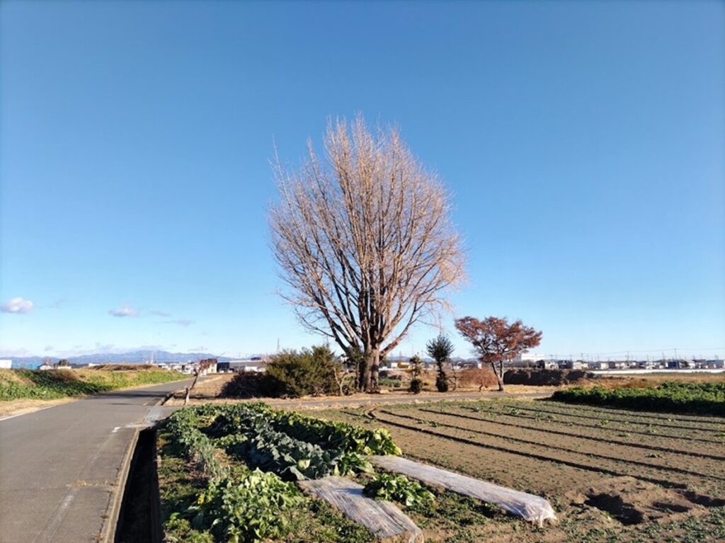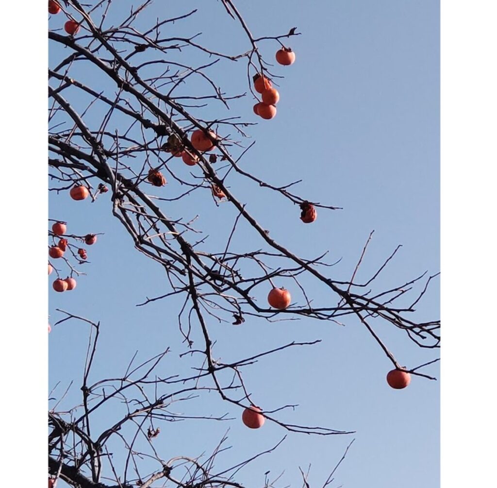 畑の中に一本だけ立つ柿の木には、まだ実が残っている。