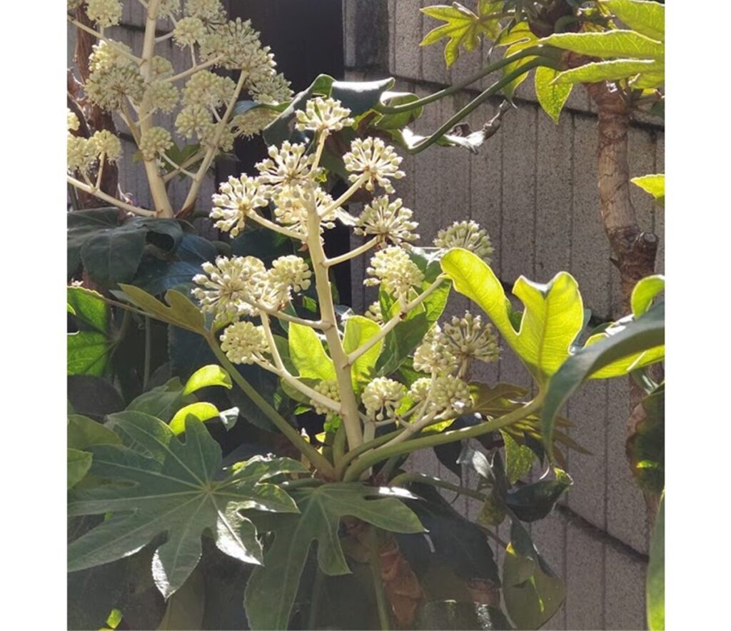 そんな中、常緑のヤツデが花を付けている。