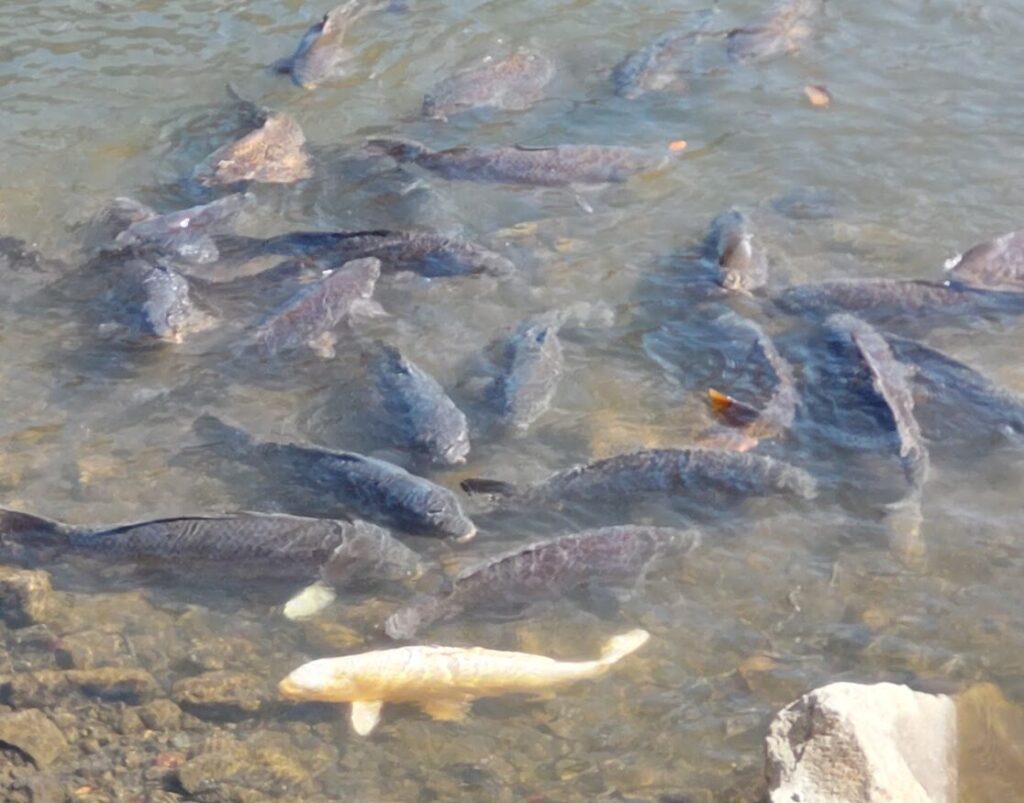 沼には鯉がたくさん泳ぎ、観光客が 餌をあげていました。