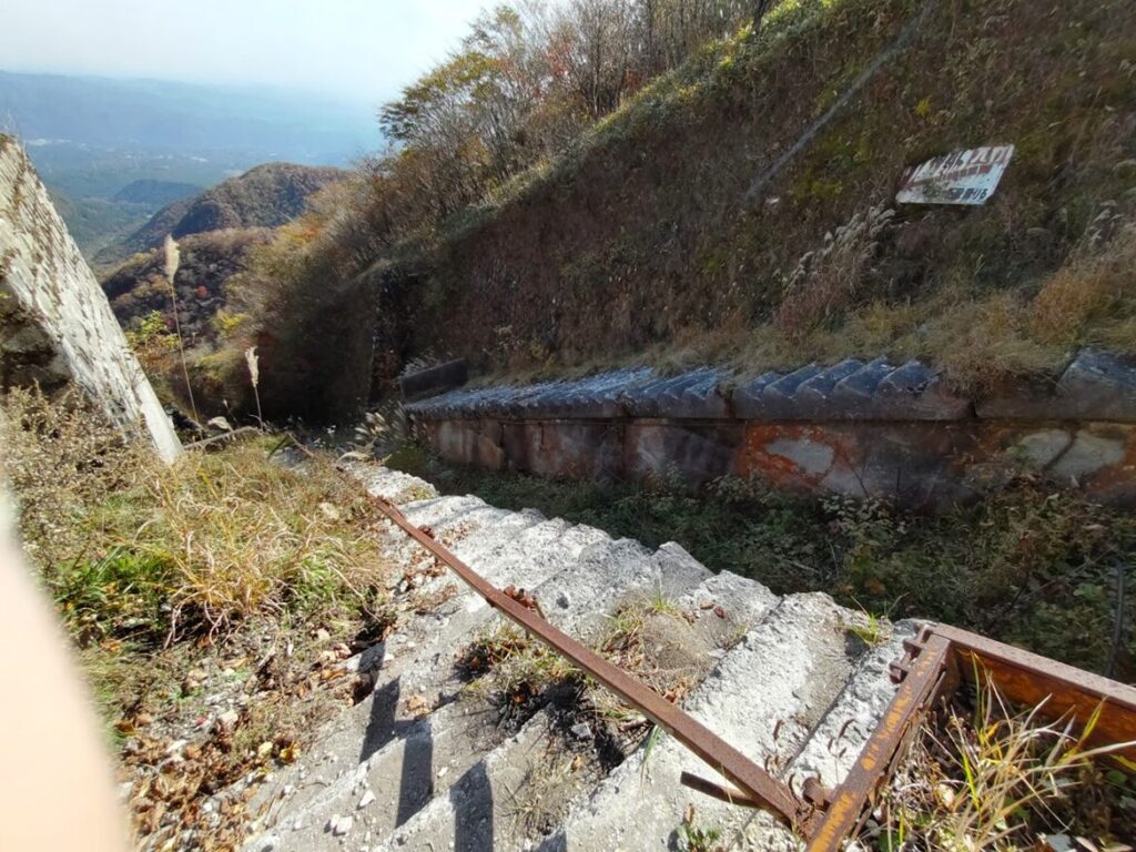 建物下に 当時の駅舎跡があります。かなり急こう配であったようです。