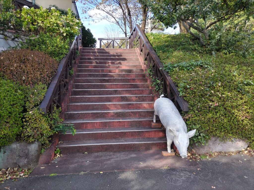 駐車場から店舗に入る 階段のわきには、ブタがいました。